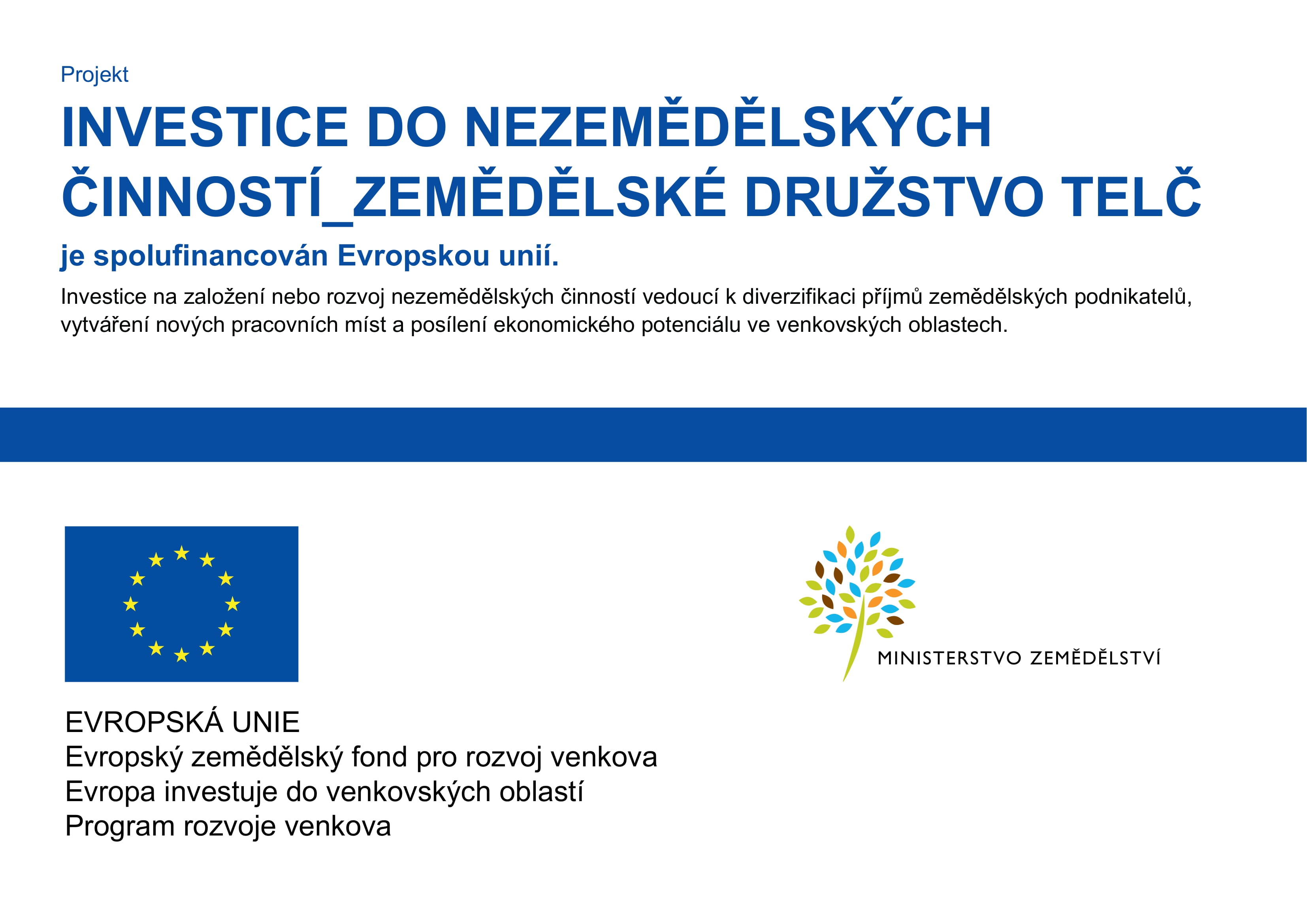 Popis projektu: Projekt „Rekonstrukce sušící linky, ZD Telč“ je spolufinancován Evropskou unií. V rámci projektu dojde ke snížení energetické náročnosti rekonstrukcí PLO a změnou vytápění využitím odpadního tepla z BPS. Projektem dojde k výměně sušící linky a dopravních cest a k realizaci teplovodní přípojky. Projekt přispěje ke snížení emisí hlavních znečišťujících látek do ovzduší.
